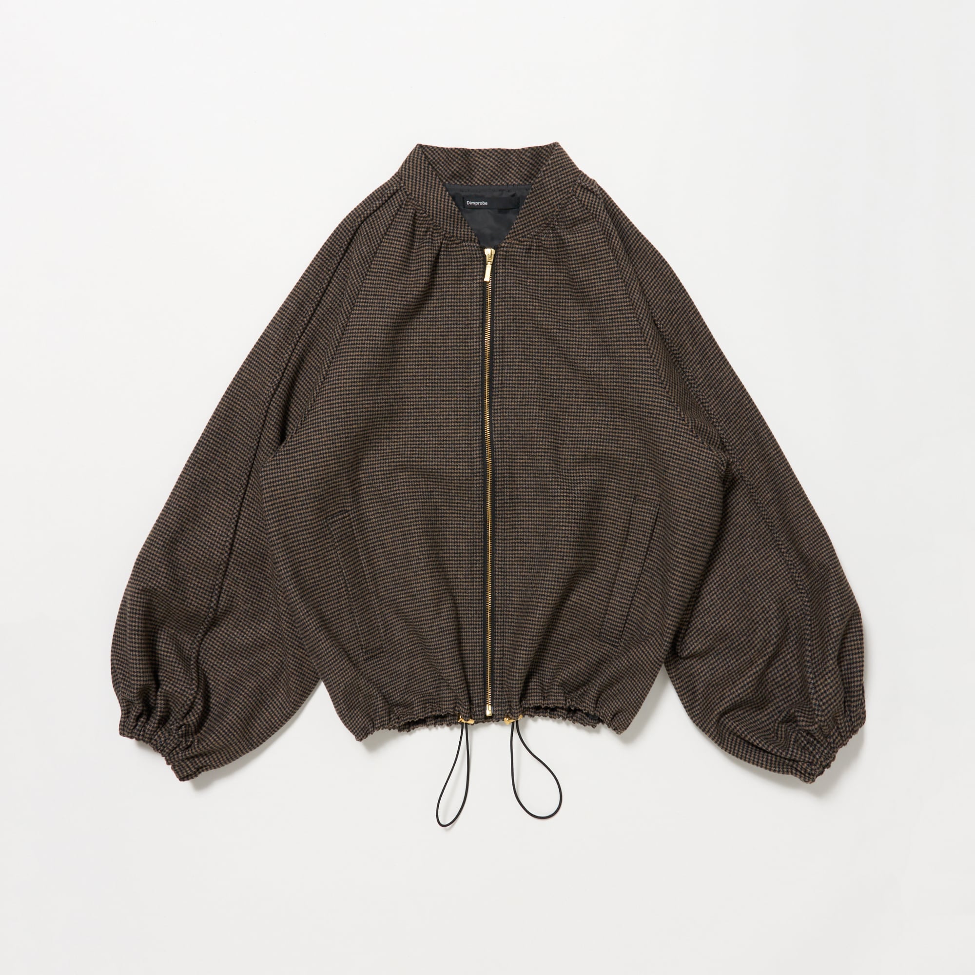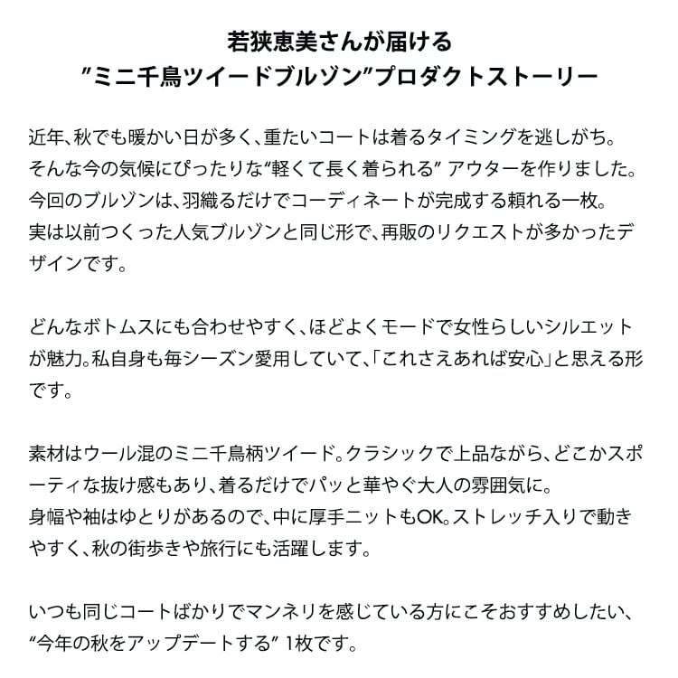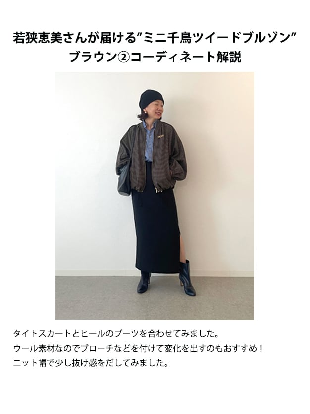 【予約販売】こちらはスタイリスト若狭恵美さんプロデュース、ミニ千鳥ツイードブルゾンのページです。カラーはブラウン・ブラックタイプです。